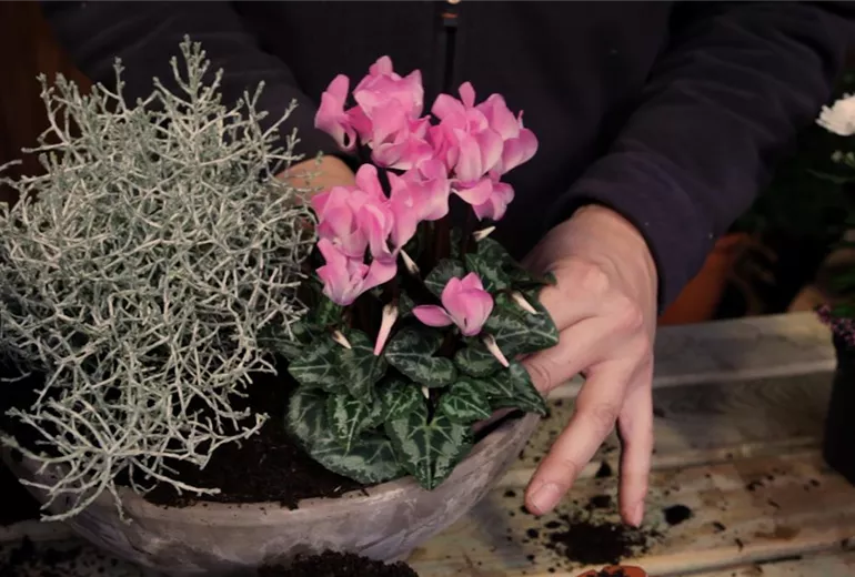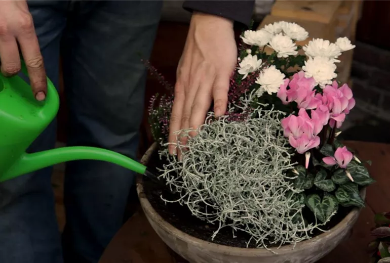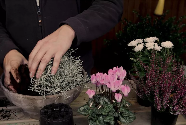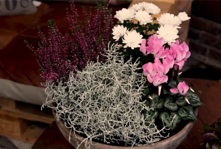 Für eine herbstliche Bepflanzung eignet sich die Kombination aus Silberdraht, Alpenveilchen, Chrysanthemen und Heide sehr gut. Die weißen und roten Farbtöne ergeben ein harmonisches Bild, das noch an herbstliche Blätter erinnert und zugleich Vorfreude auf den Winter macht. Die weiß-silbernen und die roten Pflanzen werden dabei jeweils einander gegenüber gepflanzt.