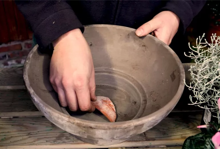 Bepflanzte Blumenkübel sollten durch Gießen nicht zu viel Pflanzerde verlieren. Deshalb legt man ein Drainagegitter oder eine Tonscherbe über das Abzugsloch.