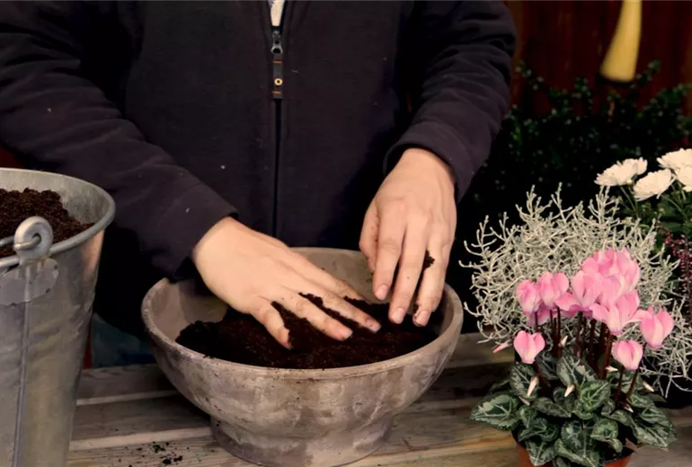 Zuletzt werden die Pflanzen noch einmal locker in die Erde gedrückt und dabei die überschüssige Pflanzerde abgetragen. Fertig ist die herbstliche Bepflanzung!