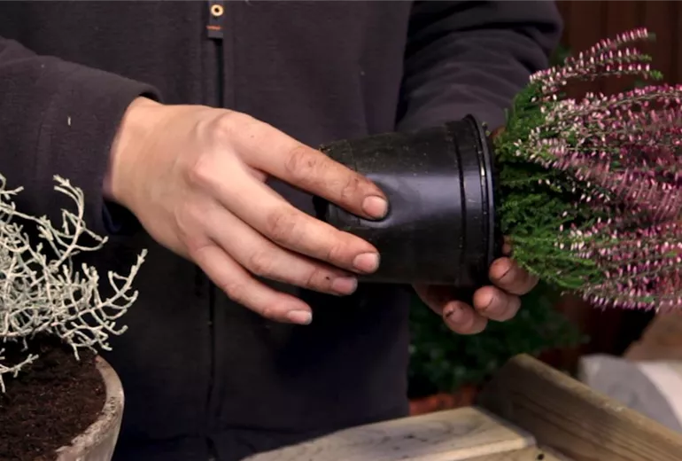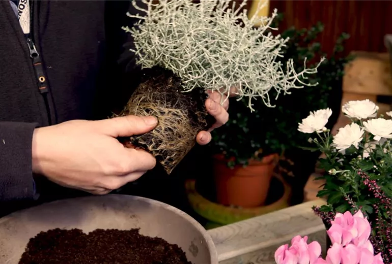 Damit die herbstlichen Pflanzen im Kübel gut gedeihen können, werden die Wurzeln vorsichtig befreit. Dann gibt man die Pflanze in die Erde.